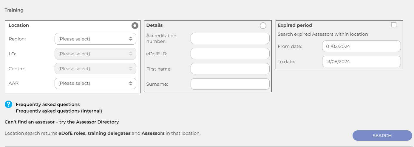 You can search for an adult via Training > Training Search. You can search by location, name, eDofE ID number, accreditation number, or search for all expired Assessors within your location. Adults returned will include: active adults in your location, archived adults with training or accreditation information, adults who have attended a training course in your location or Assessors who are currently affiliated to your location.