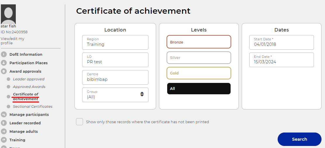 You can set search parameters using location, award level and date range & can print Certificates of Achievement for Bronze, Silver and Gold Award levels. You can select to see only the records for which the certificate has not been printed: