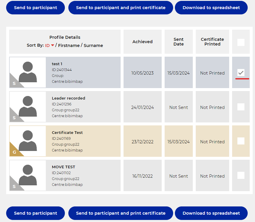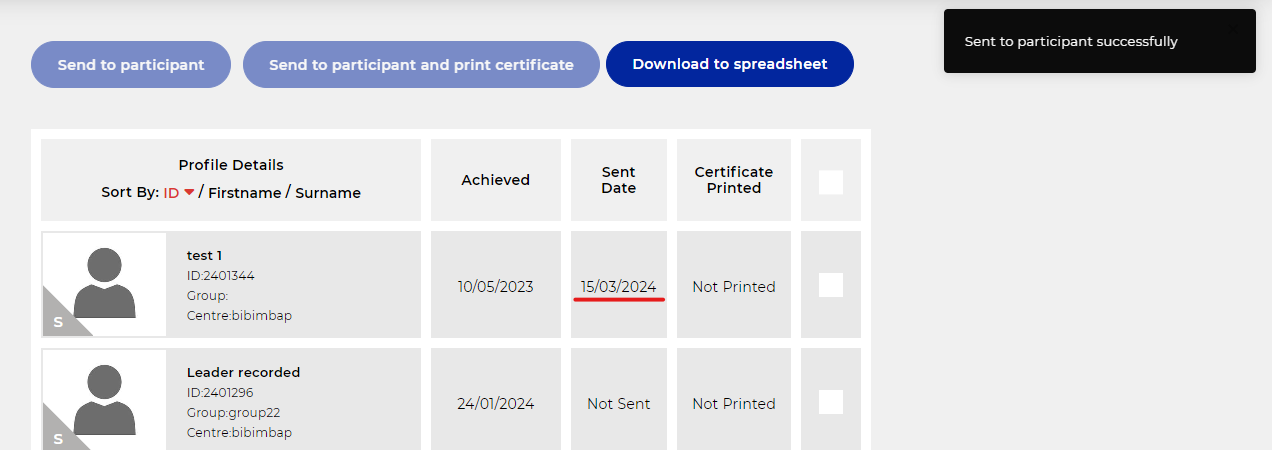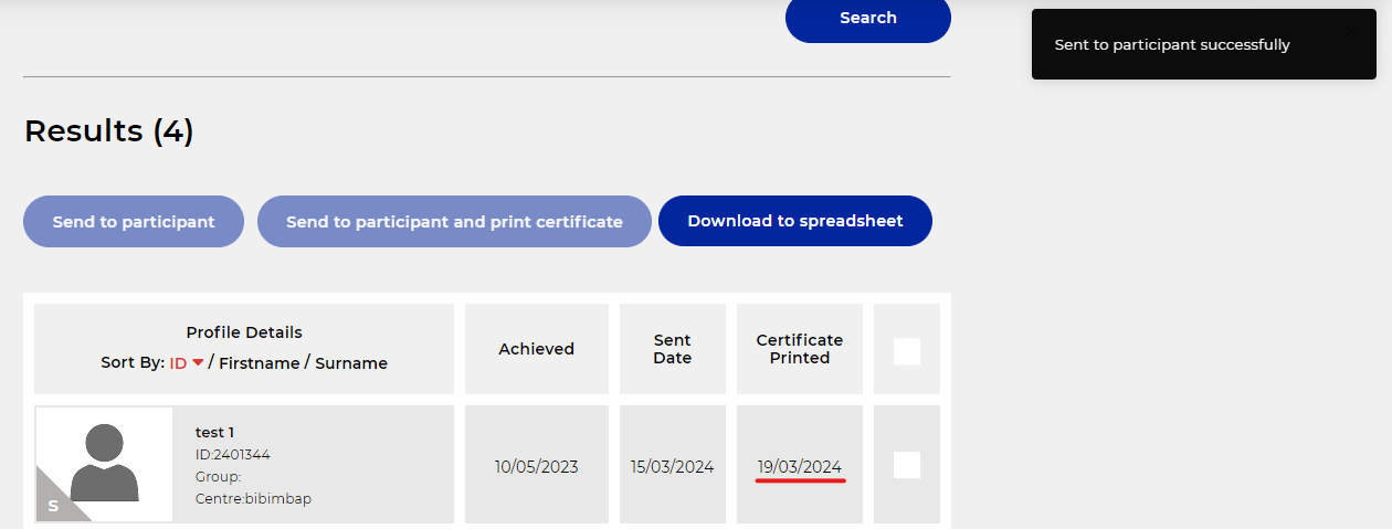 A PDF of your chosen certificate(s) will be downloaded on your computer. 50 certificates can be generated at one time, if more than 50 participants are selected, an error message will be displayed. Please note: the downloaded document depends on the format you've chosen to use on your computer. It would be best to use a PDF format. Make sure that your printer is set to ‘Actual size’, not ‘Fit to page’ or any other sizing option.