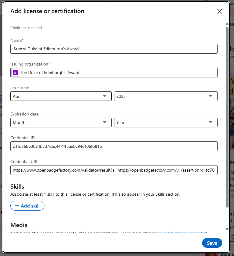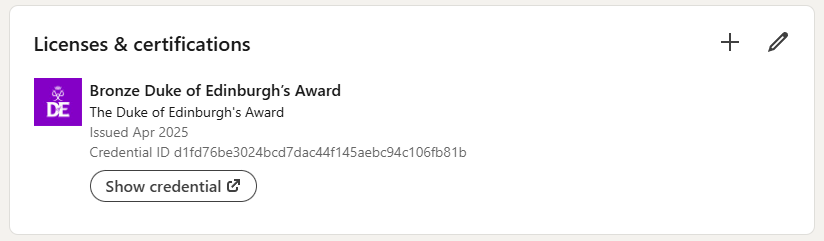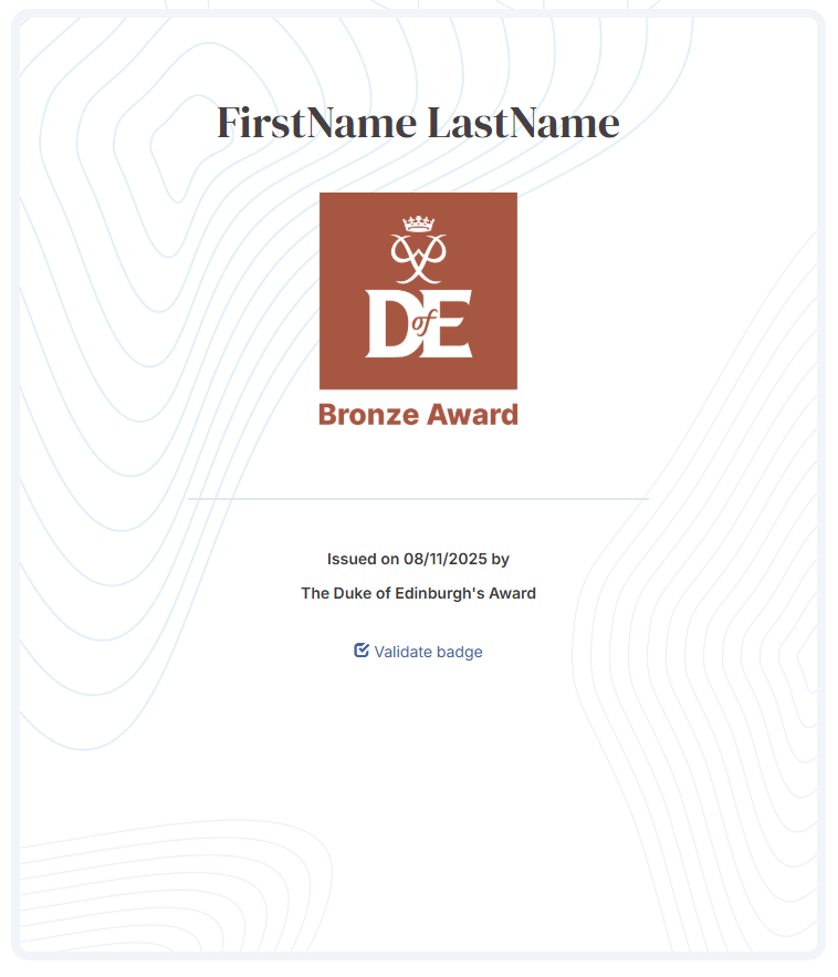 A digital badge is an online credential that recognises a young person’s achievement of their Duke of Edinburgh’s Award. It’s a verified, shareable badge that can be added to CVs, job applications and LinkedIn profiles (if over 16), helping young people showcase their skills and stand out to employers or in further education.