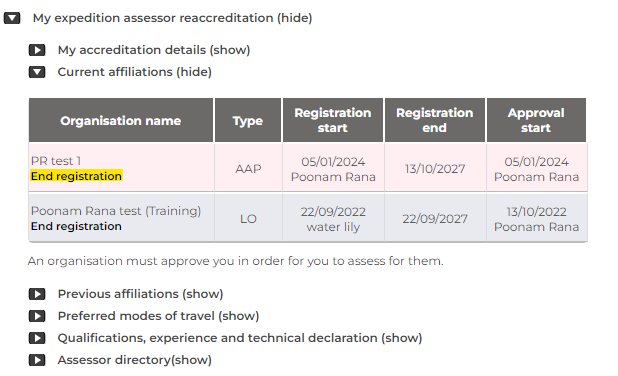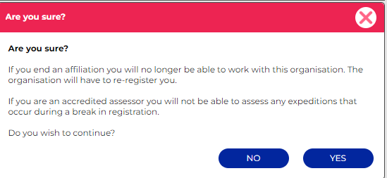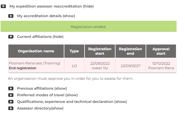 An assessor can end their registration to an organisation by going to Training > My Expedition Assessor Accreditation: