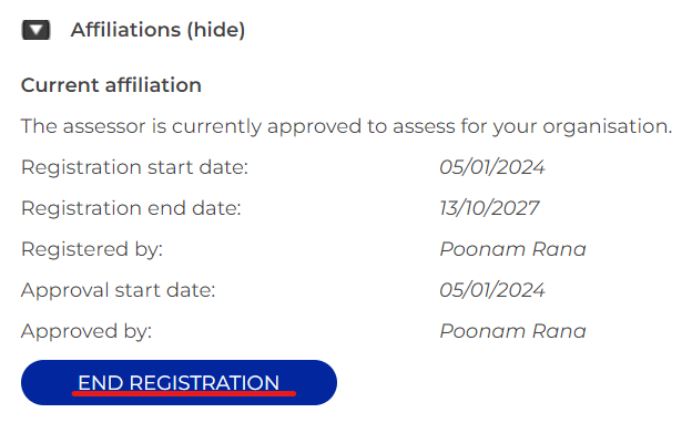 2. Select 'End registration' for the organisation that you no longer want to assess for: