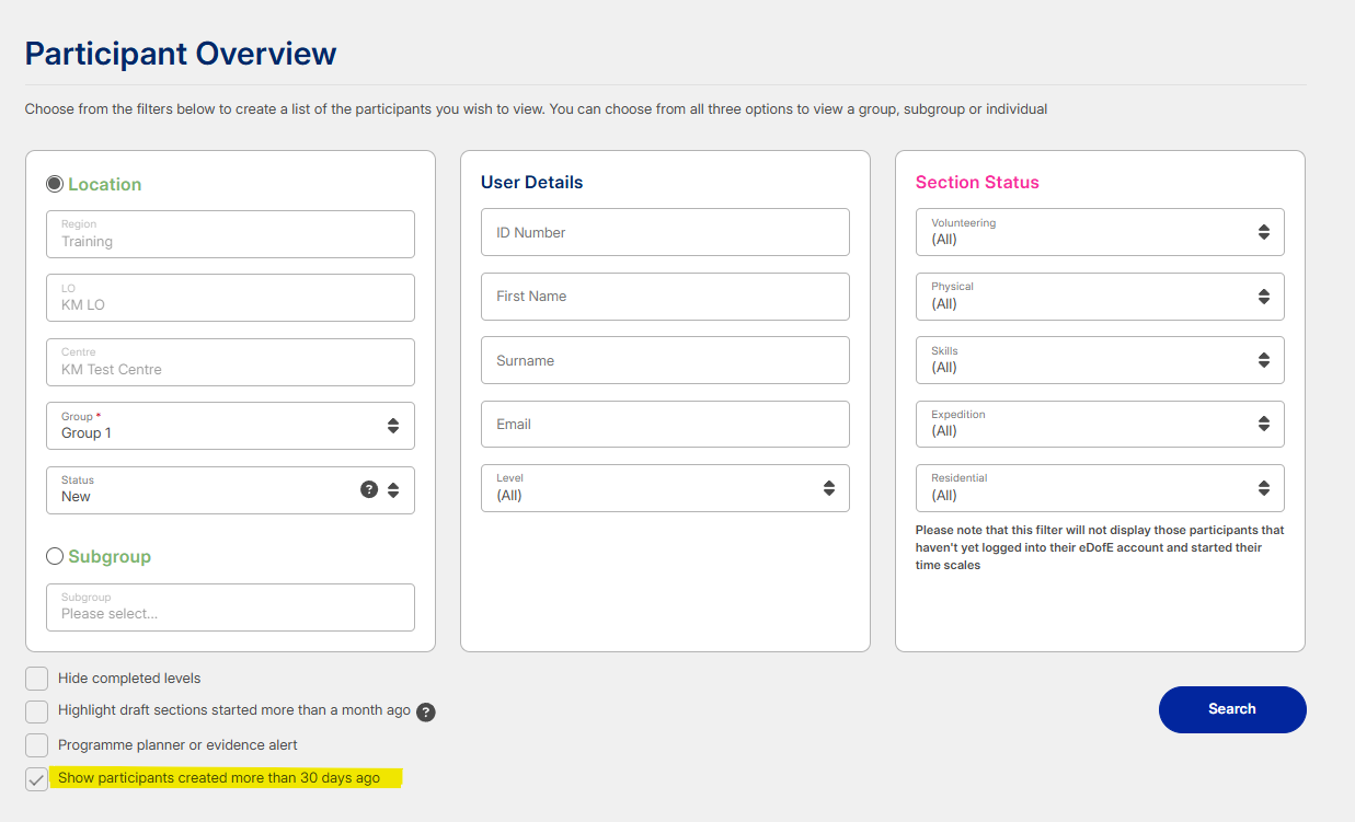 3. This will take you to the Participant Overview page where you can filter your selection accordingly.