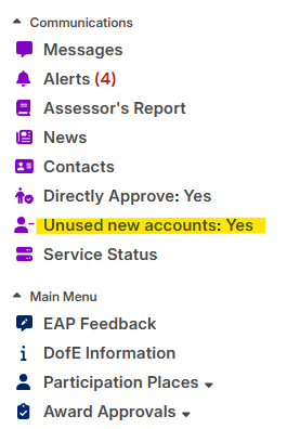 Please note: If you don't have any new participants that were created over 30 days ago, the 'Unused new account' link will not be displayed under Communications.