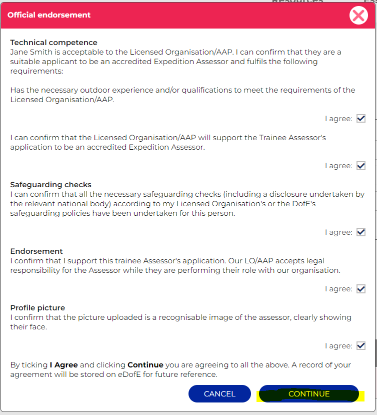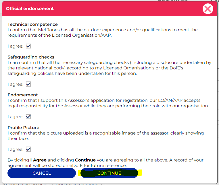 4. Confirm that that you have carried out safeguarding, legal and competency checks and click 'Continue'