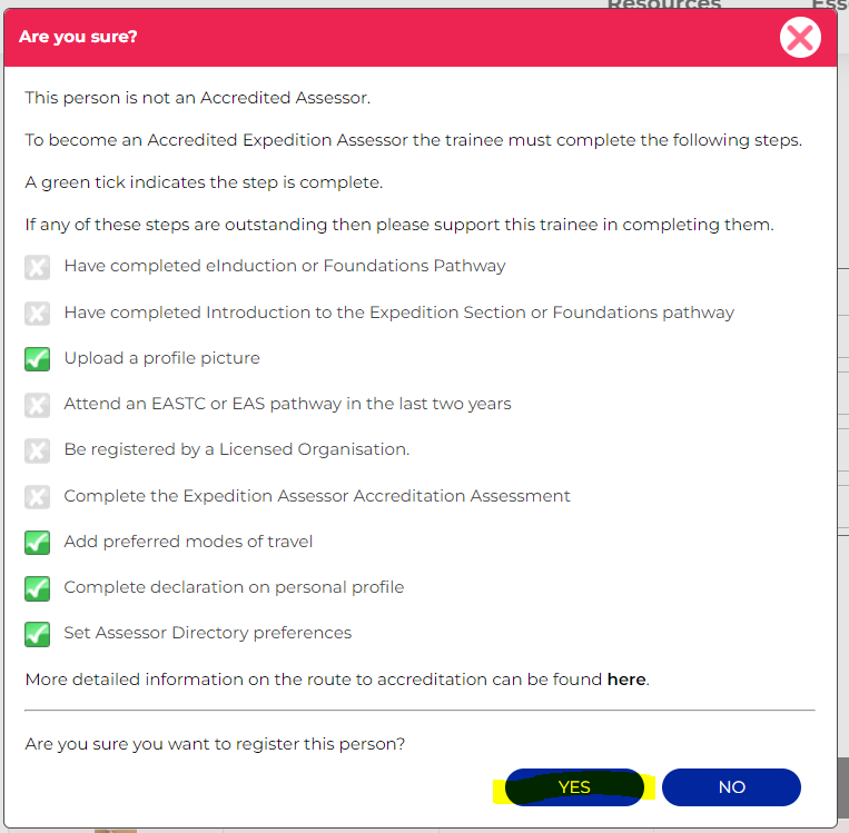 LO staff with the 'Can add and edit assessor accreditations' permission on their account can create an affiliation between their organisation and an individual. LOs can 'Register' a person which creates the affiliation. When doing this, you’ll be required to confirm that you have carried out safeguarding, legal and competency checks.