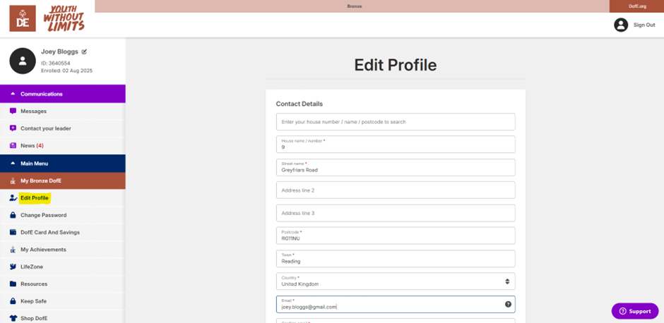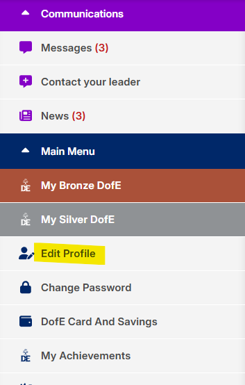 1. Once you've logged in to eDofE, select ‘Edit Profile’ from the menu.