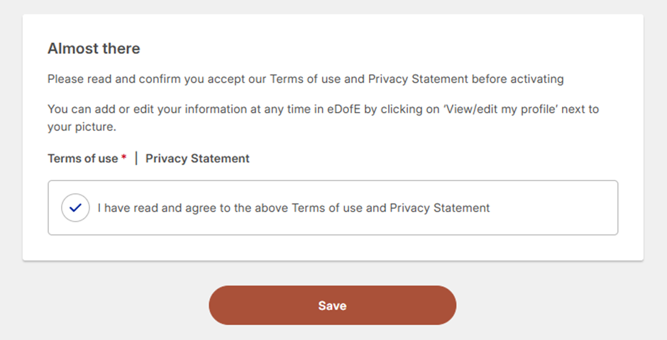 2. Once you have updated your details, you will need to agree to the Terms of use and the Privacy statement by ticking the box. Then click ‘Save’.