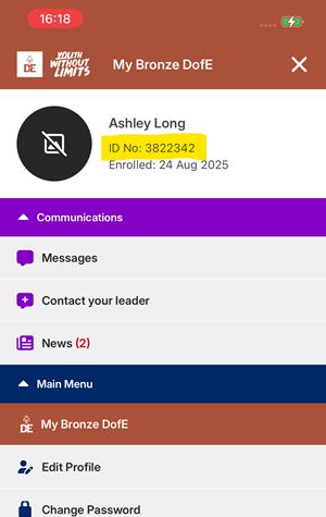You can view your ID number by selecting the menu icon in the top right-hand corner. You will then see your full name, with your ID number under it: