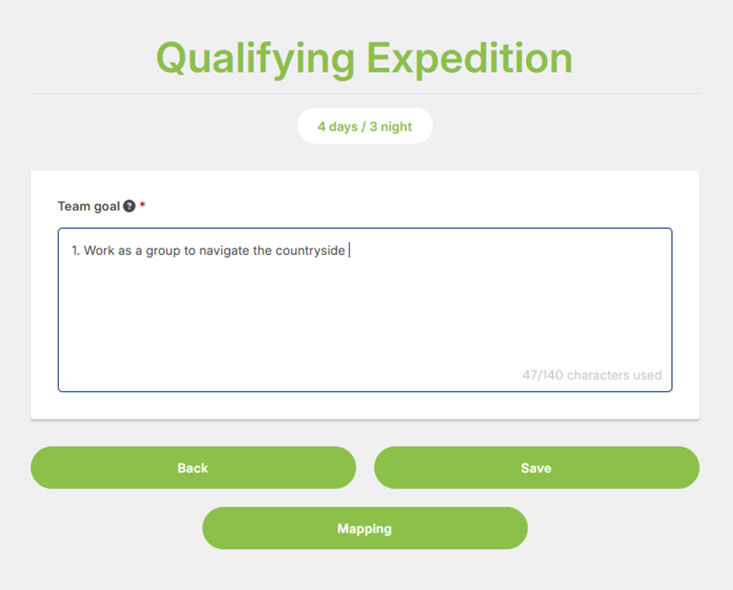 1. Enter your ‘Qualifying expedition aims and goals’ and click ‘Save’.