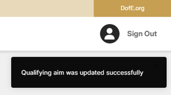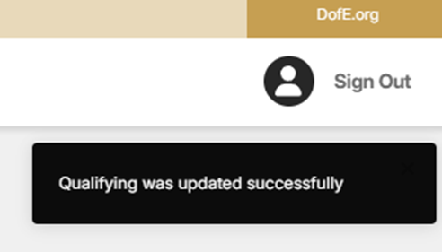4. A confirmation message will be displayed in the top right corner of eDofE to indicate the qualifying expedition details have been successfully submitted.