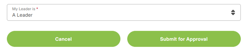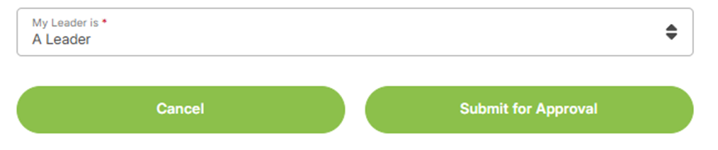 3. Once all the listed items have been completed, you will need to select your Leader from the dropdown and click the ‘Submit for Approval’ button.