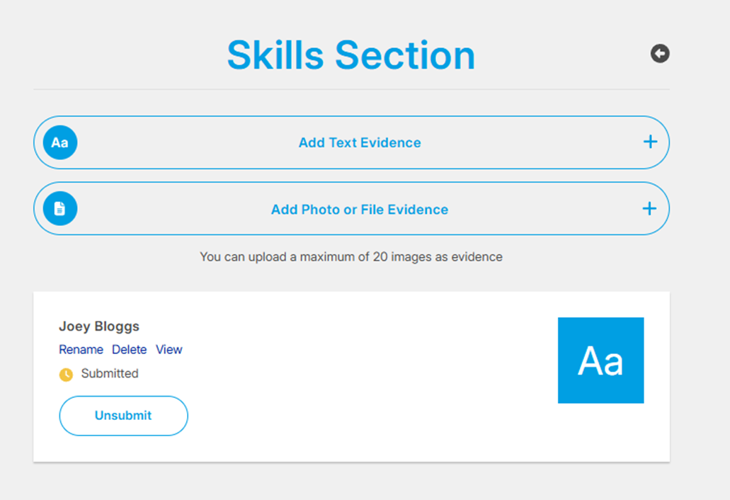 2. You will then be redirected to the ‘Manage Evidence’ page which will display the evidence you have just uploaded along with any previously uploaded evidence.