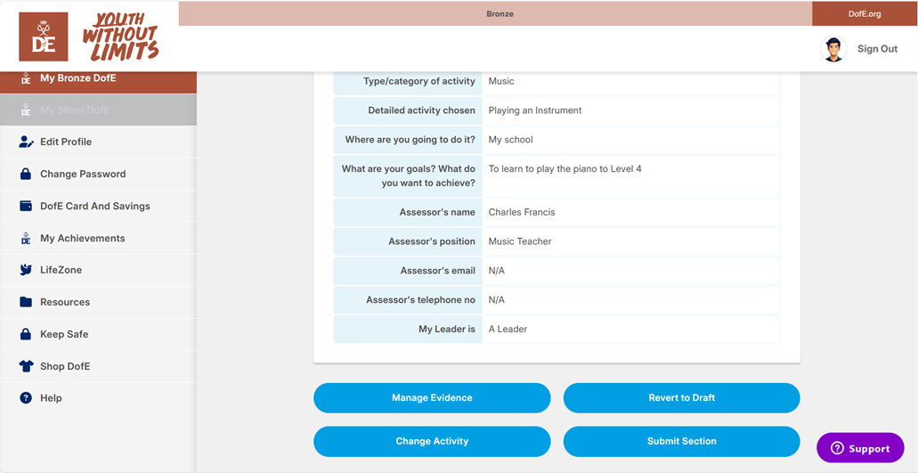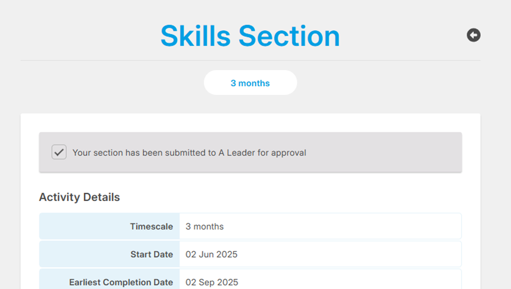 Your section will be submitted to your DofE leader for approval. A message confirming this will be displayed at the top of your section page.