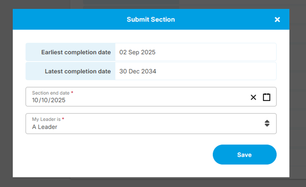 3. Select the section end date, the name of your DofE Leader and click the ‘Save’ button.