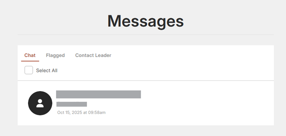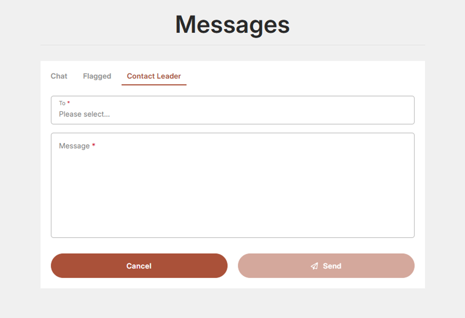 You can send a brand new message to your Leader by accessing the 'Contact Leader' tab within Messages. This can be accessed by the 'Contact your leader' menu option, or by going through the 'Messages' menu option: