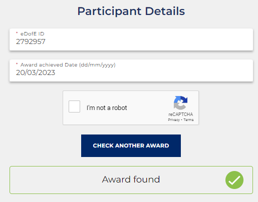 If participants information matches the completed award will show as "Award found".