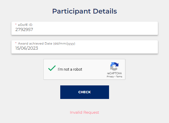 If the participant's information doesn't match the completed award "Invalid request" will show.