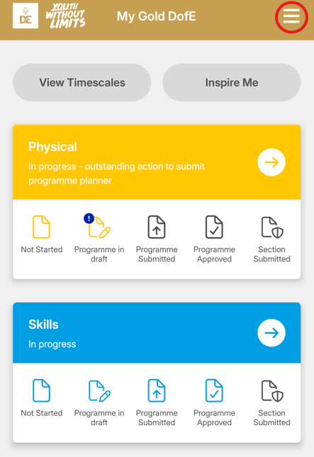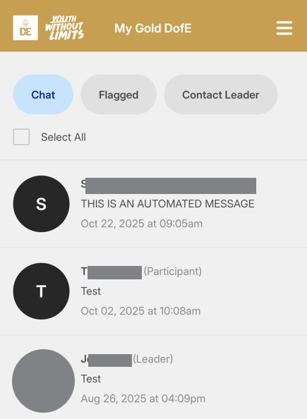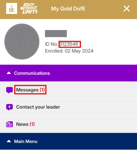 You can send messages to your DofE Leader by accessing the 'Contact your leader' menu option:
