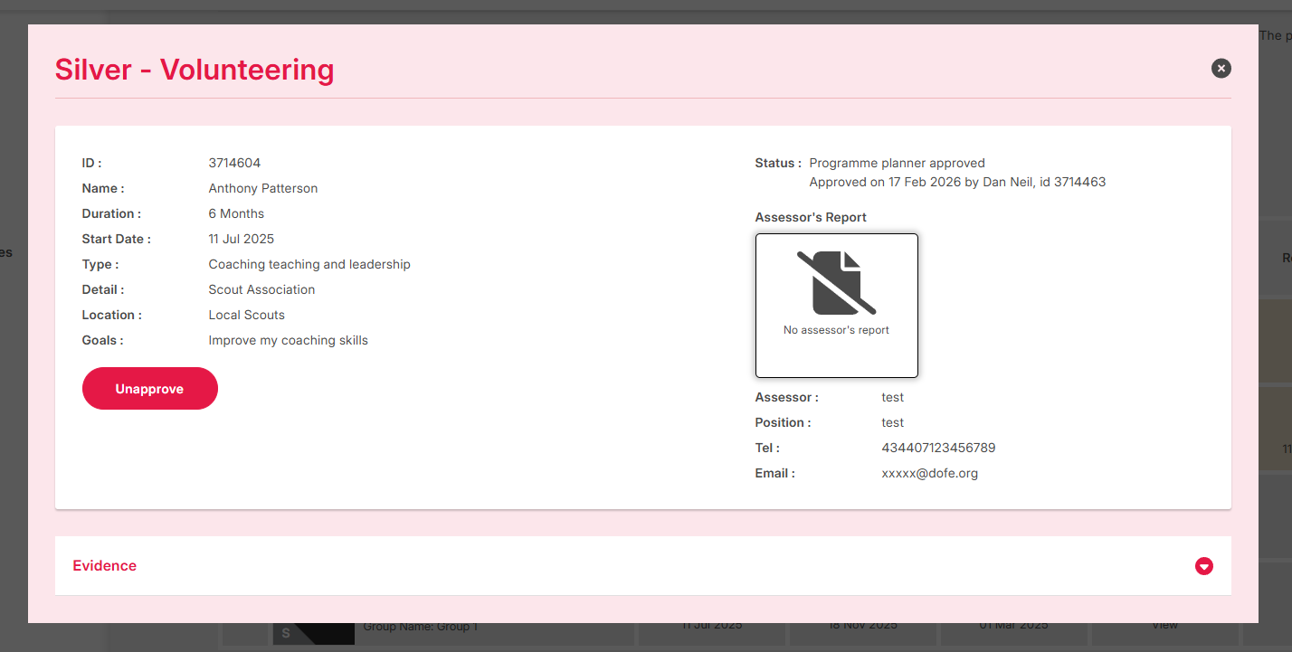 In order for a section to be completed, an appropriate Assessor's Report must be added. In addition to this, participants may wish to upload other evidence such as photos, activity logs or further details of activities they have been undertaking. When a participant adds new evidence, this evidence requires approval from their Leader. An alert is sent on eDofE to the DofE Leader notifying them of this.