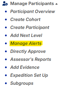 In eDofE, an alert is sent to the DofE Leader each time a piece of evidence is uploaded. The manage alerts page can be found under both the Communications section and Manage Participants --> 'Manage Alerts' in the eDofE navigation menu.