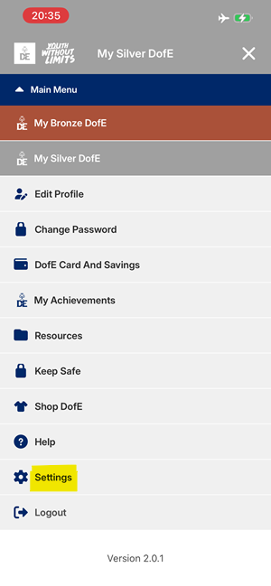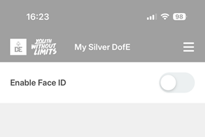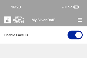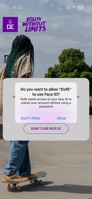 You can use touch/face ID to login to the DofE app, to save you entering your Username and password each time you sign in. This can be setup: